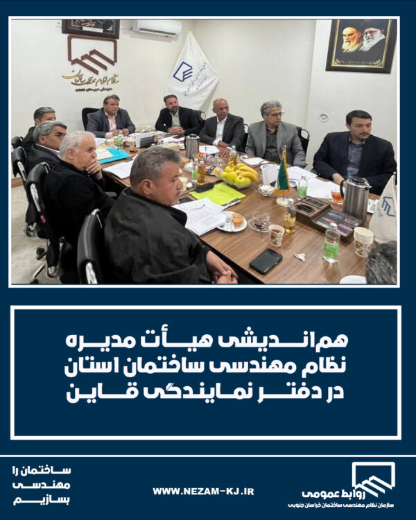 🔹 جلسه هیأت مدیره نظام مهندسی ساختمان استان با حضور ریاست محترم سازمان، اعضای محترم هیأت مدیره، مدیر نمایندگی شهرستان قاین و جمعی از مشاورین این نمایندگی، روز شنبه مورخ 26 مهرماه 1403 در دفتر نمایندگی سازمان در شهرستان قاین برگزار شد.