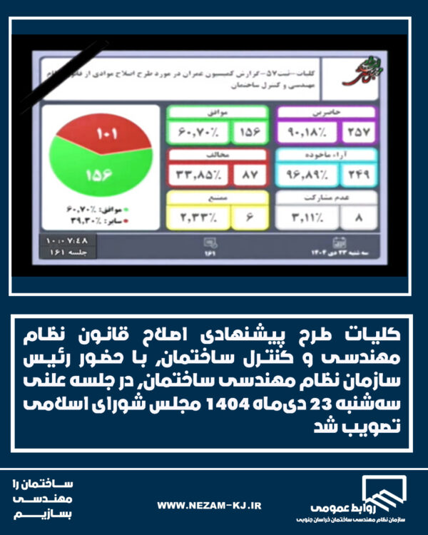 بر اساس این گزارش، کلیات طرح اصلاح قانون نظام مهندسی و کنترل ساختمان با ۱۵۶ رأی موافق از مجموع ۲۴۹ رای آرای ماخوذه، به تصویب رسید
